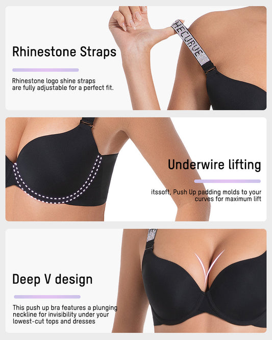 Deep V Push-Up Underwire Bra with Rhinestone Strap